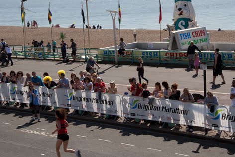 The route along the seafront (towards the finishing line) was heaving with people, and I had a couple of false starts trying to capture the sense of excitement and activity about the place - from the roadside it was difficult to take any pictures without unwanted limbs and heads getting in the way of my preferred composition. Eventually however I found an elevated spot about four hundred metres from the finish, from where I could see the runners on the road, the promenade lined with people, the beach and finally a strip of sea. On the beach was a café, with a very prominent sign advertising fish and chips, and I decided I'd like a picture of the runners passing this sign.